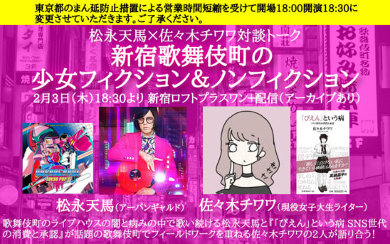 この度、新型コロナウイルス感染症の拡大防止対策に伴うまんえん防止措置が東京都に適用されたのを受け、新宿ロフトプラスワンも営業時間の時間短縮を行うこととなりましたので、申し訳ございませんが本公演の開場時間を18:00、開演時間及びオンラインスタート時間を18:30に変更させて頂きます。なにとぞご了承ください。