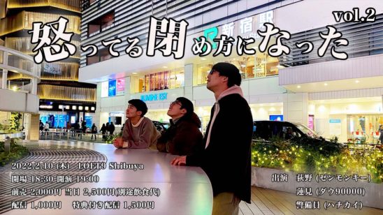ゼンモンキー・荻野、ダウ90000・蓮見、ハチカイ・警備員からなるユニットトークライブ『怒ってる閉め方になった』。普段のライブでは年上に遠慮して言えてないようなことや、そうでないことを同世代の3人だけの空間でおはなしする90分。