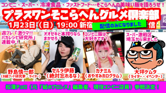 コンビニ・スーパー・冷凍食品・ファストフードなど「そこらへん」で買えるお手軽グルメを語りたい識者が集まっておいしいトークを交わします! 週刊プレイボーイの「激ウマ!!バカレシピ研究所」でおなじみの野島慎一郎さん、オオゼキと本搾りならまかせろ!なセルラ伊藤さん、コンビニ飯ならたっぷり語れるカナミルさん、スーパー激戦区埼玉から大坪ケムタさんといった面々が日曜の夜プラスワンに集まって、それぞれの今イカすご飯について語り合います。聞いてて飯と酒が進む&コンビニやスーパーに行きたくなるイベントです!