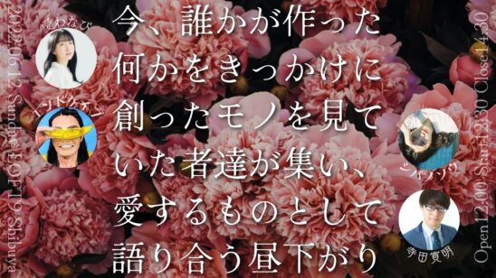 今、誰かが作った何かをきっかけに 創ったモノを見ていた者達が集い、 愛するものとして語り合う昼下がり