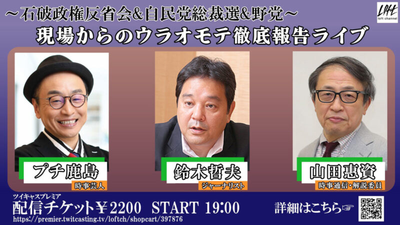 配信のみ 【出演】 プチ鹿島(時事芸人) 鈴木哲夫(ジャーナリスト) 山田惠資(時事通信・解説委員、TBSラジオ・森本 毅郎スタンバイ出演) 大好評だったライブが今年もまた!総裁選翌日に開催した昨年は石破新総裁とライブ中に電話がつながるサプライズ...