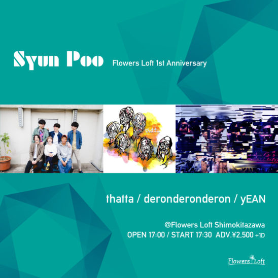 SCHEDULE 2021 03 20 Saturday Flowers Loft 1st Anniversary Syun Poo Tweet thatta deronderonderon yEAN TICKETOPEN 18:30 / START 19:00 → OPEN 17:00 / START 17:30 ※緊急事態宣言延長による営業時間短縮要請に伴い、開場・開演時間を変更いたします。 ADV. 2,500yen / DOOR. 3,000yen (別途1D) ご予約はHP、もしくは各アーティスト予約まで Share このイベントの予約は締めきりました。