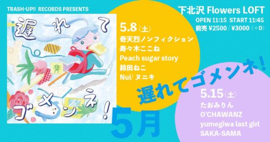 SCHEDULE 2021 05 08 Saturday DAY EVENT TRASH-UP!! RECORDS PRESENTS 「遅れてゴメンネ!」 OPEN 11:15 - START 11:45 Tweet 出演: 奇天烈ノンフィクション 寿々木ここね Peach sugar story 鈴田ねこ Nui/ヌニキ TICKETADV/DOOR ¥2,500/¥3,000 ※別途ドリンク代¥600 Share