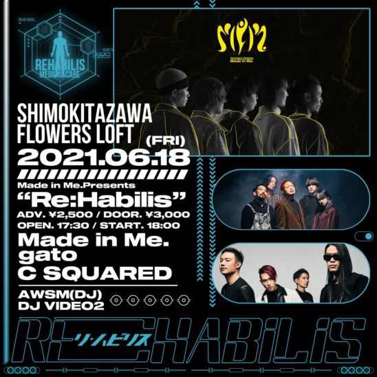 SCHEDULE 2021 06 18 Friday Made in Me. presents 「Re:Habilis」 OPEN 17:30 - START 18:00 Tweet act: Made in Me. gato C SQUARED DJ DJ VIDEO2 AWSM.(DJ) TICKETticket: adv. ¥2,500 / door. ¥3,000 (+1 drink) チケット予約は各バンド取り置きのみ Share