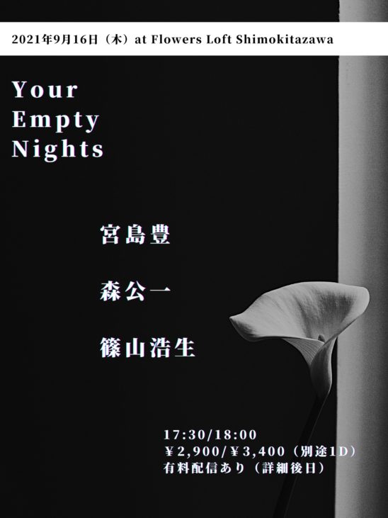 SCHEDULE 2021 09 16 Thursday Your Empty Nights OPEN 17:30 - START 18:00 Tweet 出演: 宮島豊 森公一 篠山浩生 TICKETADV/DOOR ¥2,900/¥3,400 (別途1D) ・全椅子席 ・有料生配信 ¥2,000 https://twitcasting.tv/flowers_loft/shopcart/102284 チケット予約: 以下予約フォーム、または各アーティストより Share このイベントの予約は締めきりました。