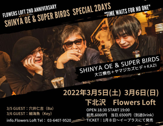 SCHEDULE 2022 03 05 Saturday Flowers Loft 2nd Anniversary Shinya Oe & Super Birds SPECIAL 2DAYS ”Time Waits For No One” OPEN 18:30 - START 19:00 Tweet 出演: Shinya Oe & Super Birds 大江慎也(Vocal&Guitar) ヤマジカズヒデ(Guitar) KAZI(Drum) GUEST:穴井仁吉(Ba) TICKETADV/DOOR ¥6,000/¥6,500 ※1D代別¥600 1/8よりe+にて発売開始 Share