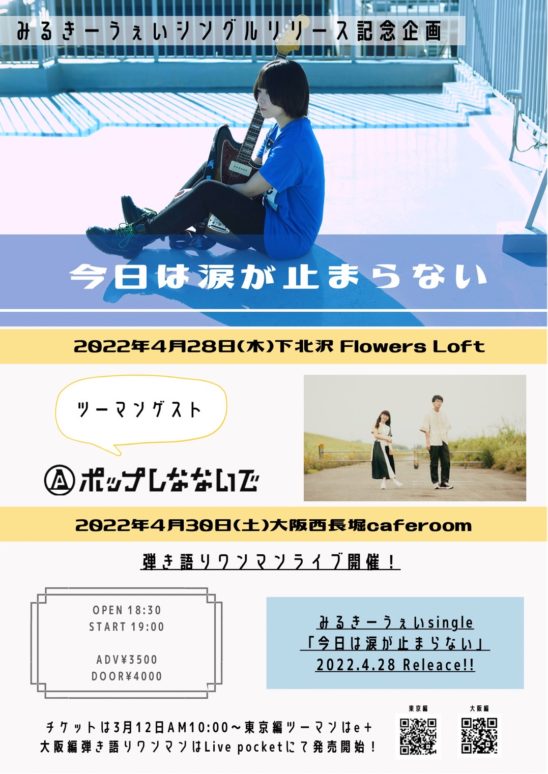 SCHEDULE 2022 04 28 Thursday みるきーうぇいリリース記念ツーマン企画「今日は涙が止まら ない」 OPEN 18:30 - START 19:00 Tweet 出演: みるきーうぇい/ポップしなないで TICKETADV/DOOR ¥3,500/¥4,000 (別途1DRINK ¥600) 3/12 (土) 10:00~ 発売開始 ■購入ページURLhttps://eplus.jp/sf/detail/3589430001-P0030001 生配信 チケット(アーカイブもあり)¥2,000 https://twitcasting.tv/flowers_loft/shopcart/151774 Share