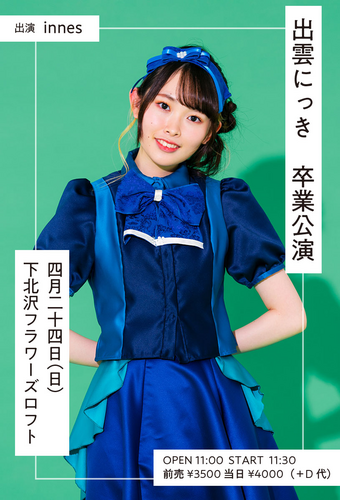 SCHEDULE 2022 04 24 Sunday DAY EVENT 出雲にっき 卒業公演 OPEN 11:00 - START 11:30 Tweet 前売 ¥3500 当日 ¥4000 https://tiget.net/events/176821 出演 innes Share