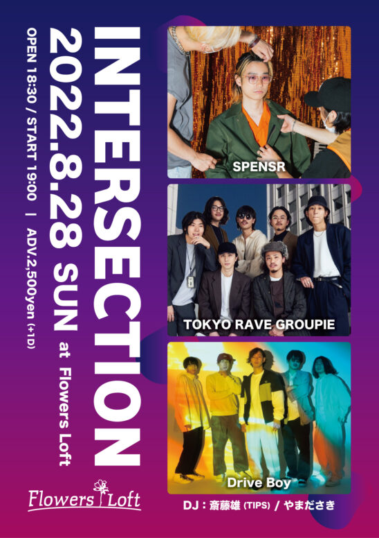 SCHEDULE 2022 08 28 Sunday INTERSECTION OPEN 18:30 - START 19:00 Tweet 出演: SPENSR TOKYO RAVE GROUPIE Drive Boy DJ: 斎藤雄(TIPS) やまださき TICKETADV. ¥2,500 / DOOR. ¥3,000 (共に別途1D) 各アーティスト予約 / Flowers Loft 予約 Share このイベントの予約は締めきりました。
