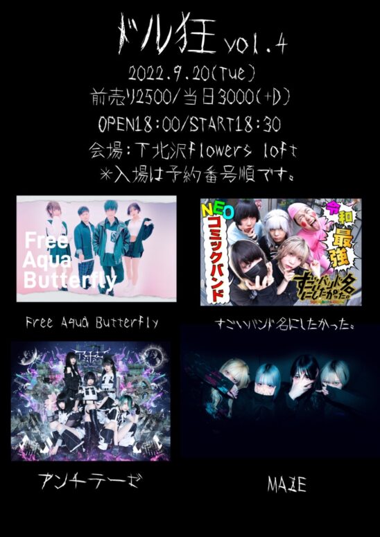 SCHEDULE 2022 09 20 Tuesday ドル狂vol.4 OPEN 18:00 - START 18:30 Tweet 出演 Free Aqua Butterfly すごいバンド名にしたかった。 MAZE アンチテーゼ TICKETADV¥2,500/DOOR¥3,000(共に別途1D) [予約開始日]8/27(土) 18:00〜 下記予約フォームより受付開始 ※入場は予約番号順です Share このイベントの予約は締めきりました。