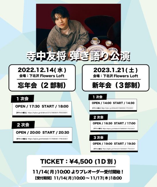 SCHEDULE 2022 12 14 Wednesday 忘年会(2部制) Tweet 出演:寺中友将(KEYTALK) TICKET・1次会 17:30/18:00 ・2次会 20:00/20:30 プレオーダー [受付期間]11月14日(月)10:00~11月17日(木)18:00 https://eplus.jp/sf/detail/3757980001-P0030001 Share