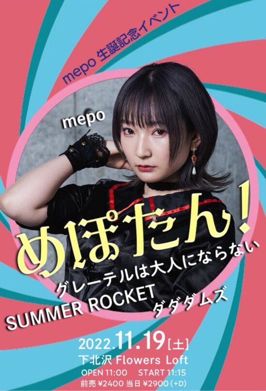 SCHEDULE 2022 11 19 Saturday DAY EVENT ダダダムズ mepo生誕イベント「めぽたん!」 OPEN 11:00 - START 11:15 Tweet 出演: mepo ダダダムズ グレーテルは大人にならない SUMMER ROCKET innes TICKET前売2400円(+D代) 当日2900円(+D代) https://tiget.net/events/210345 Share