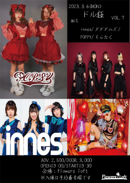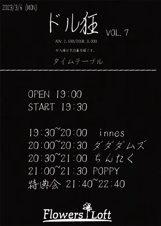 SCHEDULE 2023 03 06 Monday ドル狂 vol.7 OPEN 19:00 - START 19:30 Tweet 出演: innes ダダダムズ ちんたく POPPY ※入場は予約番号順です。 TICKET予約開始は3/1 18 :00 前売り¥2,500/当日¥3,000(+D) チケット予約は以下より Share このイベントの予約は締めきりました。