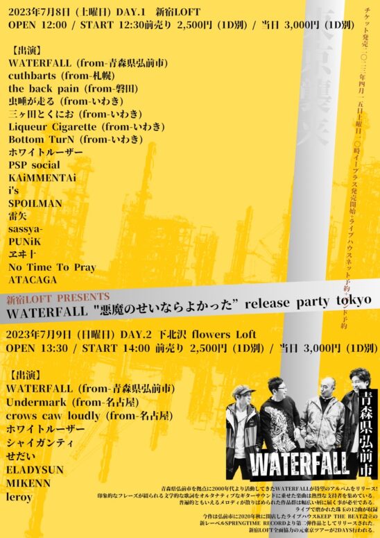 青森県弘前市を拠点に2000年代より活動してきたWATERFALLが待望のアルバムをリリース!印象的なフレーズが綴られる文学的な歌詞をオルタナティブなギターサウンドに乗せた楽曲は熱烈な支持者を集めている。普遍的ともいえるメロディが散りばめられた作品群は幅広い層に届く事が必至である。ライブで磨かれた珠玉の12曲が収録。今作は弘前市に2020年秋に開店したライブハウスKEEP THE BEAT設立の新レーベルSPRINGTIME RECORDより第二弾作品としてリリースされた。新宿LOFT全面協力で東京ツアーが2DAYS行われる。