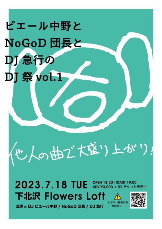 SCHEDULE 2023 07 18 Tuesday ピエール中野とNoGoD団長とDJ急行のDJ祭vol.1 OPEN 18:30 - START 19:00 Tweet DJピエール中野 NoGoD団長 DJ急行 TICKETチケット:オールスタンディング adv.¥3,000(別途1D) 5/13(土) 12:00〜 e+(スマチケ)一般発売開始 ■購入ページURL https://eplus.jp/sf/detail/3873310001-P0030001 ピヤホン持参の方に特典あり Share