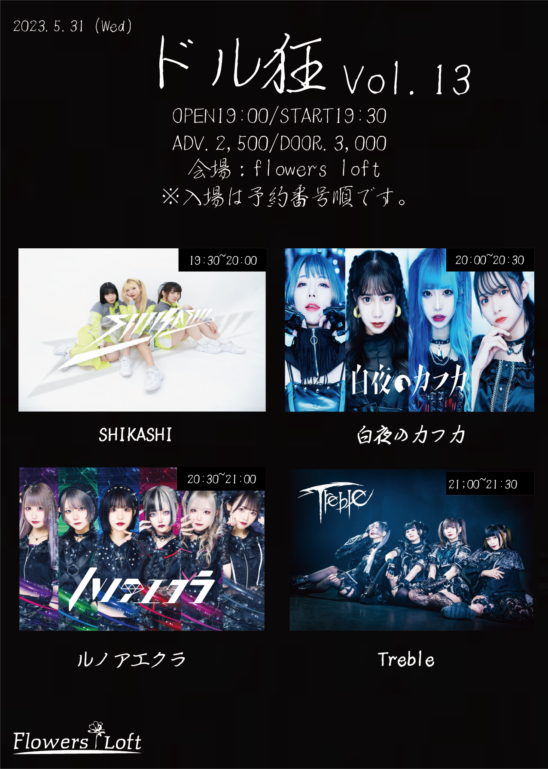 SCHEDULE 2023 05 31 Wednesday ドル狂Vol.13 OPEN 19:00 - START 19:30 Tweet 出演: SHIKASHI 白夜のカフカ ルノアエクラ Treble TICKET前売り¥2,500 当日¥3,000 チケット予約は以下より Share このイベントの予約は締めきりました。