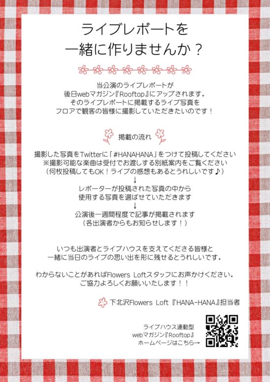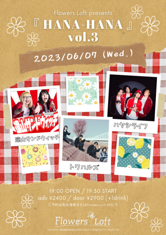 SCHEDULE 2023 06 07 Wednesday Flowers LOFT presents 『HANA-HANA vol.3』 OPEN 19:00 - START 19:30 Tweet 遠山サンドウィッチ トワハルズ ハヤシライフ TICKETADV ¥2,400 / DOOR ¥2,900(各+1D¥600) 【TICKET】 Flowers LOFT HP予約・各出演者予約 Share このイベントの予約は締めきりました。