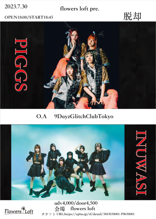 SCHEDULE 2023 07 30 Sunday Flowers Loft Presents 脱却 OPEN 18:30 - START 19:00 Tweet 出演: PIGGS INUWASI O.A 9DayzGlitchClubTokyo TICKET チケット発売日 2023.6.10 12:00~ チケットのご購入はこちらから→ https://eplus.jp/sf/detail/3883030001-P0030001 Share