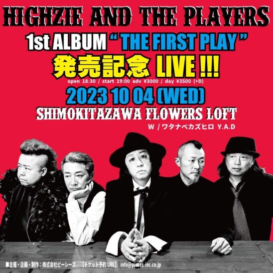SCHEDULE 2023 10 04 Wednesday HIGHZIE AND THE PLAYERS 1stAlbum「THE FIRST PLAY」発売記念LIVE!!! OPEN 18:30 - START 19:00 Tweet HIGHZIE AND THE PLAYERS ワタナベカズヒロ Y.A.D TICKETADV¥3000 / DOOR¥3500(DRINK代別¥600) [発売] チケット予約 info@pieces-inc.co.jp Share
