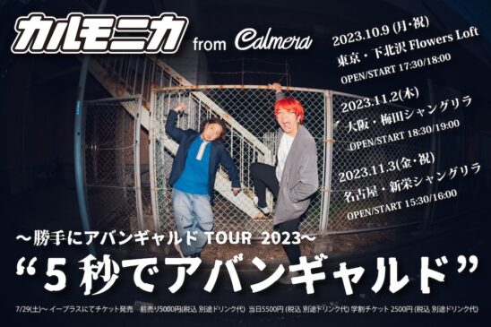 SCHEDULE 2023 10 09 Monday 〜勝手にアバンギャルドTOUR 2023〜『5秒でアバンギャルド in 東京』 OPEN 17:30 - START 18:00 Tweet カルモニカ from Calmera TICKET前売り 一般¥5000 / 学割¥2500 当日 一般¥5500 ※各チケットDRINK代別¥600 [発売]eplus 7月29日(土)10:00〜 ※学割:大学生、専門学生以下年齢不問、要学生証提示 Share
