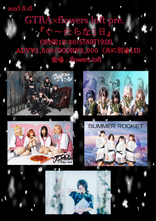 SCHEDULE 2023 08 15 Tuesday GTRA×flowers loft pre. 『ぐ〜たらな1日』 OPEN 18:30 - START 19:00 Tweet 出演: GTRA TOKYOてふてふ TOROi SUMMER ROCKET 愛探眼影 TICKET前売り¥1,500/当日¥2,000(+D) チケットのご予約は以下より Share このイベントの予約は締めきりました。