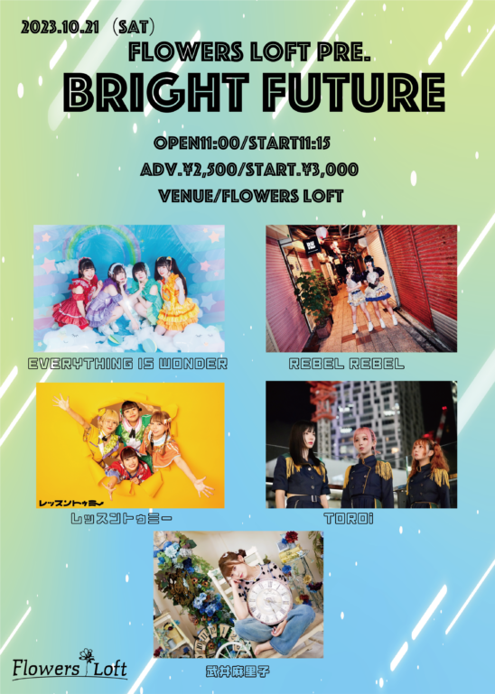 SCHEDULE 2023 10 21 Saturday DAY EVENT flowers loft pre. 『bright future』 OPEN 11:00 - START 11:15 Tweet 出演: REBEL REBEL EVERYTHING IS WONDER TOROi 武井麻里子 レッスントゥミー TICKET前売り¥ 1,500/当日¥2,000(+D) チケットのご予約は以下より→ Share このイベントの予約は締めきりました。
