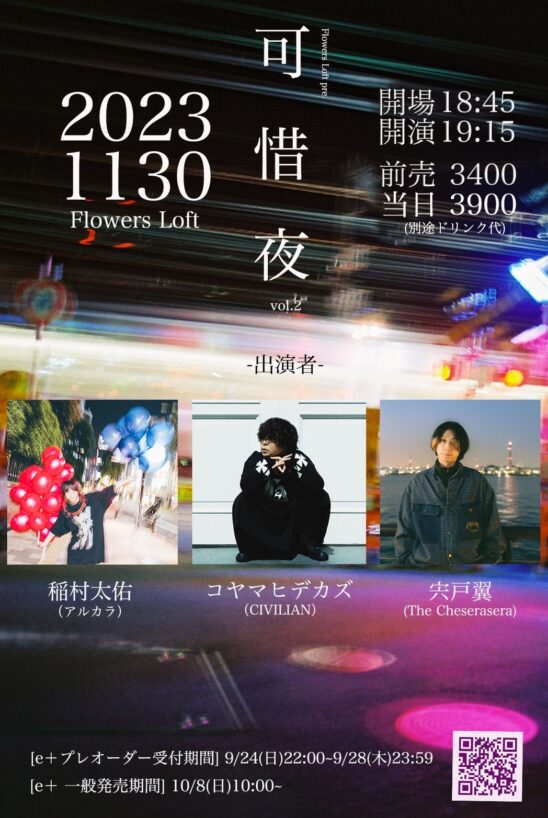SCHEDULE 2023 11 30 Thursday Flowers Loft pre. 『可惜夜 vol.2』 OPEN 18:45 - START 19:15 Tweet 稲村太佑(アルカラ) コヤマヒデカズ(CIVILIAN) 宍戸翼(The Cheserasera) TICKETADV ¥3,400 / DOOR ¥3,900(+1D¥600) 【TICKET】 ①e+最速プレオーダー(〜9月28日(木)23:59まで) ②e+一般発売(10月8日(日)10:00〜) 【入場順】 ①e+プレオーダー(A No,1~)②e+一般発売(B No,1〜) Share