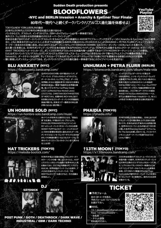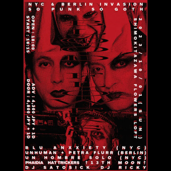 初来日を遂げるNYCのダークパンク/デスロック/オカルトウェイヴの英雄BLU ANXXIETY( ブルー・アンクザエティー)の Anarchy & Eye Liner Tour 最終日に、ともに再来日だがジョイントユニット形式では初披露となるBERLIN拠点のエレクトロWAVEユニット UNHUMAN + PETRA FLURR(アンヒューマン&ペトラ・フラー)をまさかの召喚に成功。 さらにはNYCからダークシンセウェイヴ/EBMのUN HOMBRE SOLO(ウン・オンブレ・ソ ロ)もジョイントを果たす。
