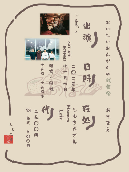 SCHEDULE 2023 11 07 Tuesday おてまえ OPEN 19:00 - START 19:30 Tweet chef’s CAT ATE HOTDOGS TICKETADV ¥2,900 / DOOR ¥3,400(+1D¥600) 【TICKET】 e+一般発売(10/1 10:00~) Share