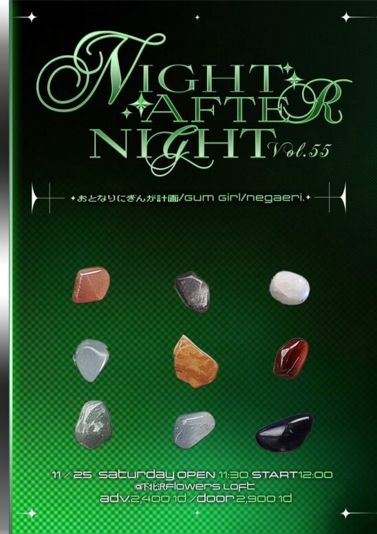 SCHEDULE 2023 11 25 Saturday DAY EVENT 『night after night vol.55』 OPEN 11:30 - START 12:00 Tweet おとなりにぎんが計画 negaeri. Gum Girl フライヤーデザイン:ヒカリ TICKETADV ¥2,400 / DOOR ¥2,900(+1D¥600) 【TICKET】 主催メール予約 qurulium@gmail.com 各バンド予約 Share