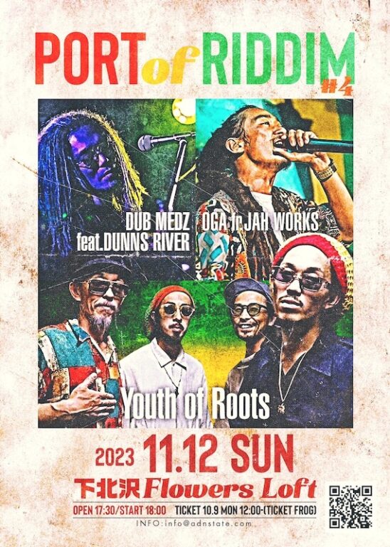 SCHEDULE 2023 11 12 Sunday PORT of RIDDIM #4 OPEN 17:30 - START 18:00 Tweet 出演: Youth of Roots DUB MEDZ feat. DUNNS RIVER OGA fr.JAH WORKS TICKETチケット 前売り ¥4,000 (D別) 10/9 12:00 より以下にて発売開始 https://ticket-frog.com/e/portofriddim_4 Share
