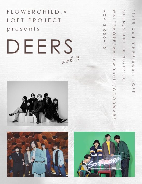 SCHEDULE 2023 11 15 Wednesday FLOWERCHILD.×LOFT PROJECT presents 『DEERS vol.3』 OPEN 18:30 - START 19:00 Tweet WALTZMORE Mellow Youth GOODWARP TICKETADV ¥3,000 / DOOR ¥3,500(+1D¥600) 【TICKET】 LivePocket一般発売(10/14 10:00〜) 【入場順】 Livepocket(No,1〜) Share