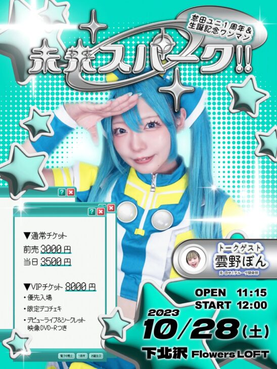 SCHEDULE 2023 10 28 Saturday DAY EVENT 怠田ユニ1周年&生誕記念ワンマン 「未来スパーク‼︎」 OPEN 11:15 - START 12:00 Tweet 出演: 怠田ユニ トークゲスト:雲野ぼん TICKET通常チケット 前売3000円 当日3500円 VIPチケット 8000円 ・優先入場 ・限定デコチェキ ・デビューライブ&シークレット映像DVD-Rつき チケットはこちらから→ https://tiget.net/events/274624 10/14 19:00よりTIGETにて予約&発売開始 Share