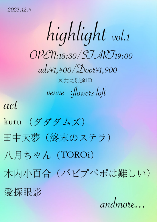 SCHEDULE 2023 12 04 Monday highlight OPEN 18:30 - START 19:00 Tweet 出演: kuru (ダダダムズ) 田中天夢(終末のステラ) 八月ちゃん(TOROi) 木内小百合(パピプペポは難しい) 愛探目影 TICKETチケット料金 前売り¥1,400/当日¥1,900 チケットのご予約はこちらから→ Share このイベントの予約は締めきりました。