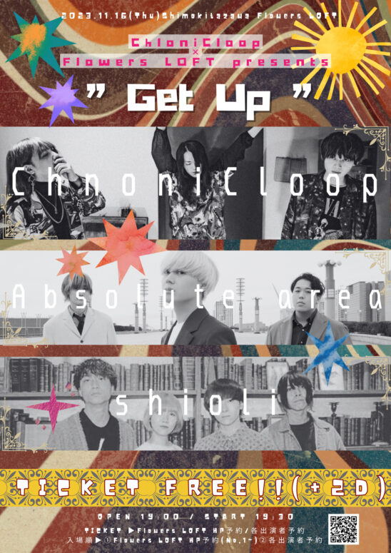 SCHEDULE 2023 11 16 Thursday ChroniCloop × Flowers LOFT presents ” Get Up ” OPEN 19:00 - START 19:30 Tweet ChroniCloop Absolute area shioli TICKETTICKET FREE!!!(入場時別途+2D ¥1,200要) 【TICKET】 Flowers LOFT HP予約(10/26 12:00〜) 各出演者予約 ※必ずチケットのご予約をお願いいたします。 【入場順】 ①Flowers LOFT HP予約(No,1〜)②各出演者予約(整列順) Share このイベントの予約は締めきりました。