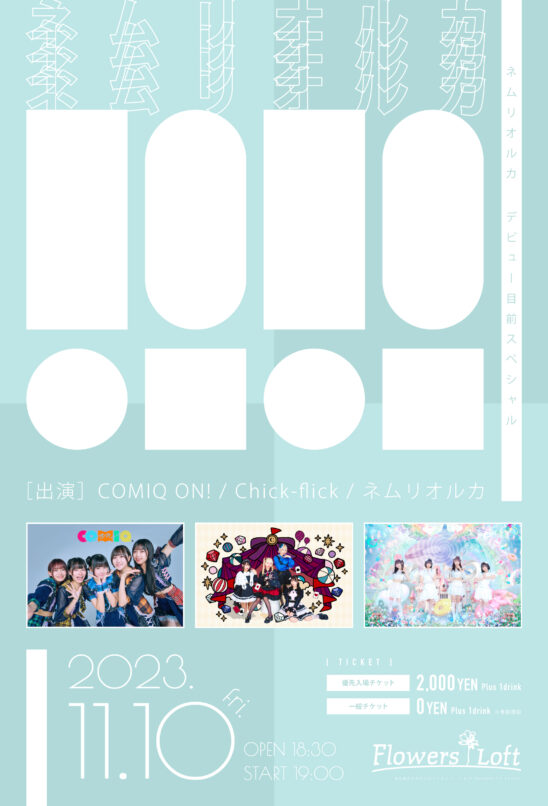 SCHEDULE 2023 11 10 Friday ネムリオルカ デビュー目前SP 「 ネ ム リ オ ル カ !!!! 」 OPEN 18:30 - START 19:00 Tweet [出演] COMIQ ON! / Chick-flick / ネムリオルカ TICKET[TICKET] 優先入場チケット:¥2,000 一般チケット:¥0 (1D事前徴収) チケットはこちらから→ https://t.livepocket.jp/e/w7s7o チケット販売:10/24(火)20:00~11/10(金)12:00 Share