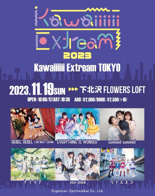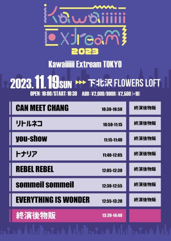 SCHEDULE 2023 11 19 Sunday DAY EVENT Kawaiiiiii Extream TOKYO 2023 OPEN 10:00 - START 10:30 Tweet 出演: REBEL REBEL EVERYTHNG IS WONDER sommeil sommeil トナリア you-show リトルネコ TICKET前売り¥2,000/当日¥2,500(共に別途+1D) Share
