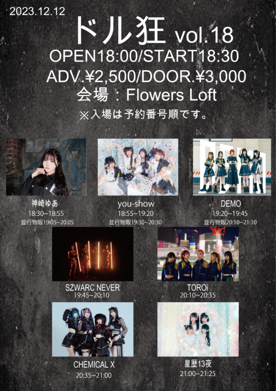 SCHEDULE 2023 12 12 Tuesday flowers loft pre. ドル狂vol.18 OPEN 18:00 - START 18:30 Tweet 出演: 神崎ゆあ you-show DEMO SZWARC NEVER TOROi CHEMICAL X 星歴13夜 TICKET前売り¥2,500/当日¥3,000 チケットのご予約は以下より→ Share このイベントの予約は締めきりました。