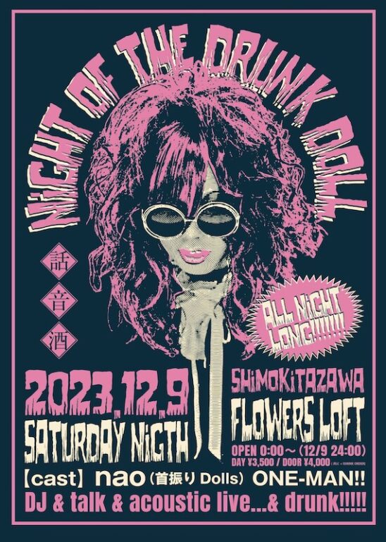SCHEDULE 2023 12 09 Saturday MIDNIGHT EVENT NIGHT OF THE DRUNK DOLL -All Night event- OPEN 24:00 - START 24:00 Tweet 【cast】 nao(首振りDolls)one-man! 【show】 DJ talk acoustic drunk!! TICKETticket 3,500 door4,000 (1D別) Live Pocketにて整理番号チケット発売開始 11/25 20:00〜 https://t.livepocket.jp/e/onenm Share