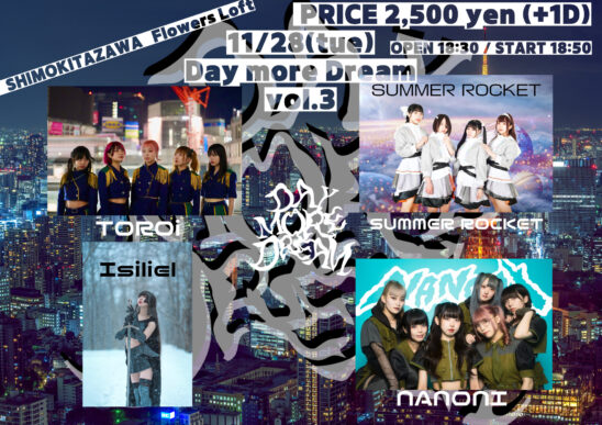 SCHEDULE 2023 11 28 Tuesday 『Day more Dream vol.3』 OPEN 18:30 - START 18:50 Tweet 出演/TOROi / NANONI / SUMMER ROCKET/ Isiliel TICKETチケット 2500円 チケットはこちらから→ https://t.livepocket.jp/e/uq1w0 Share