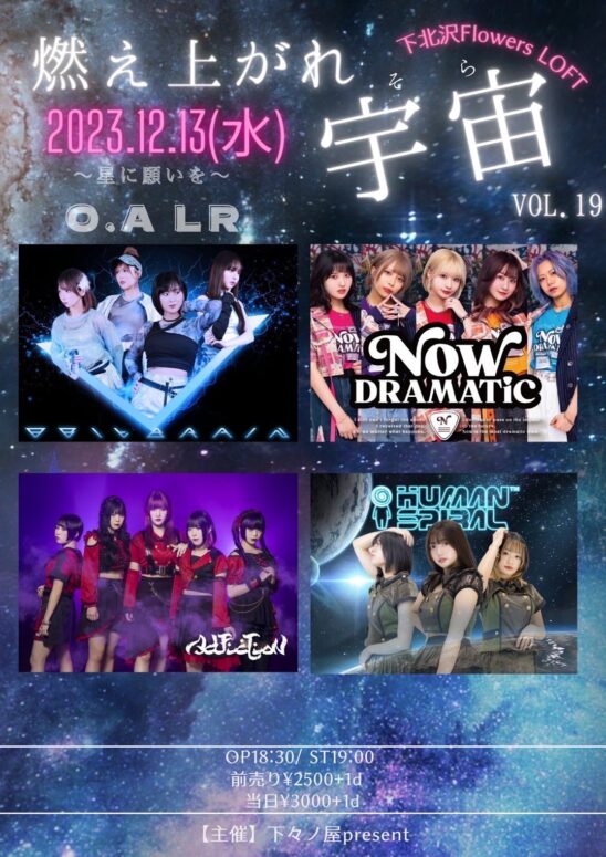 SCHEDULE 2023 12 13 Wednesday 『燃えあがれ宇宙』Vol.19 星に願いを OPEN 18:30 - START 19:00 Tweet 出演者: AdFicTioN 8bitBRAIN NOW DRAMATiC HUMAN螺旋 O.A. LR from 螺旋 TICKET前売り2500+1d/ 当日3000+1d 予約フォーム主催一括 https://tiget.net/events/283357 Share
