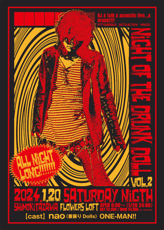 SCHEDULE 2024 01 20 Saturday MIDNIGHT EVENT NIGHT OF THE DRUNK DOLL -ALL NIGHT LONG‼-vol.2 OPEN 24:00 - START 24:00 Tweet 【cast】 nao(首振りDolls)one-man! 【show】 DJ talk acoustic drunk!! TICKETticket 3,500 door4,000 https://t.livepocket.jp/e/huvhm 12/26火曜日 20:00〜発売開始 Share