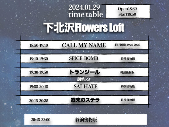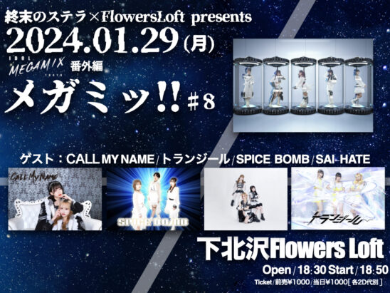 SCHEDULE 2024 01 29 Monday メガミッ#8 OPEN 18:30 - START 18:50 Tweet 出演: CALL MY NAME SPICE BOMB トランジール SAI-HATE 終末のステラ TICKETチケット代¥1,000(別途+1D) Share このイベントの予約は締めきりました。