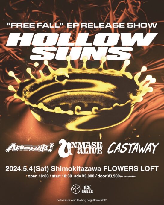 SCHEDULE 2024 05 04 Saturday Hollow Suns 「Free Fall」Release Show OPEN 18:00 - START 18:30 Tweet Hollow Suns ANORAK! UNMASK aLIVE Castaway TICKETadv/¥3000+1D door/¥3500+1D TICKETS: ■購入ページURL https://eplus.jp/sf/detail/4060100001-P0030001 Share