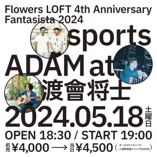 SCHEDULE 2024 05 18 Saturday Flowers LOFT 4th Anniversary Fantasista 2024 OPEN 18:30 - START 19:00 Tweet sports ADAM at 渡會将士 TICKETADV ¥4,000 / DOOR ¥4,500(+1D¥600) 【TICKET】 ①e+最速プレオーダー(3月16日(土)20:00〜3月21日(木)23:59) ②e+一般発売(3月30日(土)10:00〜) 【入場順】 ①e+最速プレオーダー(A No,1〜)②e+一般発売(B No,1〜) Share