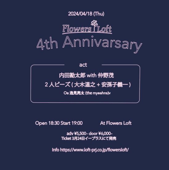 SCHEDULE 2024 04 18 Thursday FlowersLoft 4th Anniversary OPEN 18:30 - START 19:00 Tweet 内田勘太郎 with 仲野茂 2人ピーズ(大木温之+安孫子義一) Oa 逸見亮太(the myeahns) TICKETADV¥5500 / DOOR¥6000(DRINK代別¥600) [発売]eplus 3月24日(日)10:00〜 Share