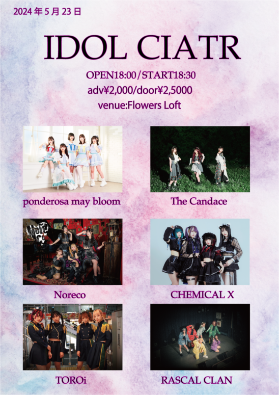 SCHEDULE 2024 05 23 Thursday IDOL CIATR OPEN 18:00 - START 18:30 Tweet 出演: The CandaceTOROi Noreco ponderosa may bloom RASCAL CLAN CHEMICAL X TICKET前売り¥2,000/当日¥2,500 ご予約は以下よりお願い致します。 Share このイベントの予約は締めきりました。
