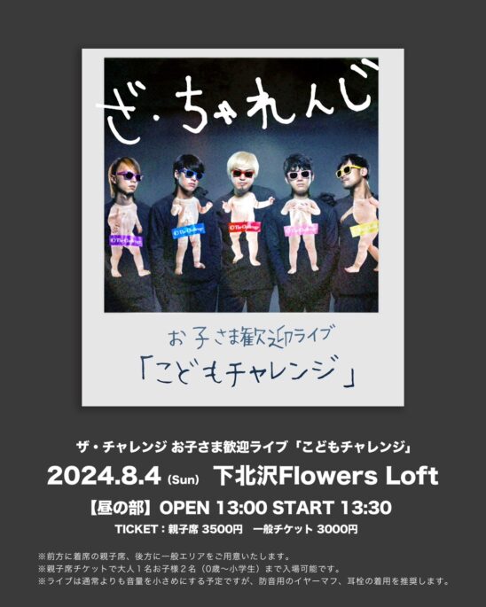 - 前売(親子席) ¥3,500 / 前売(一般席) ¥3,000 / 当日券 未定(+1D¥600)