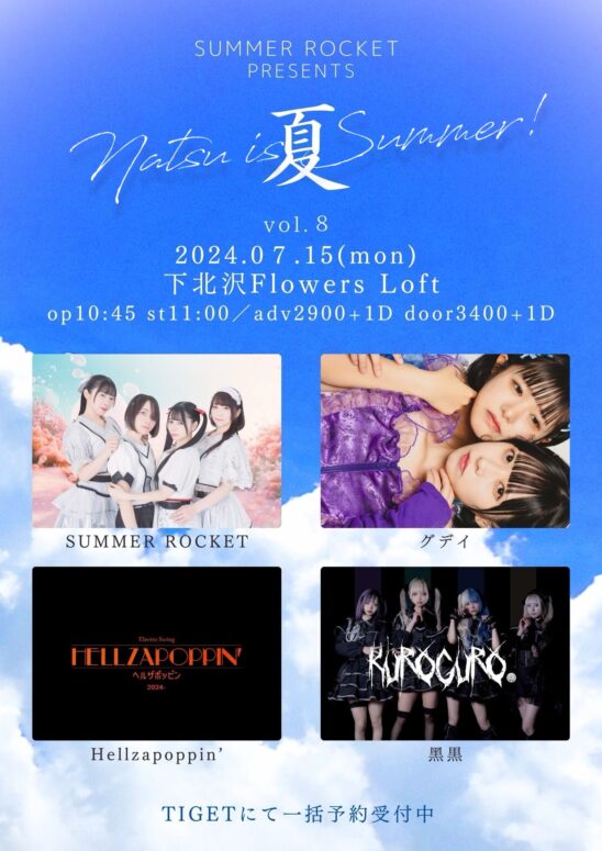 SCHEDULE 2024 07 15 Monday DAY EVENT 夏 is Summer! vol.8 OPEN 10:45 - START 11:00 Tweet SUMMER ROCKET グデイ Hellzapoppin’ 黑黒 TICKETADV ¥2,900 / DOOR ¥3,400(+1D) 【TICKET】 TIGKET Share