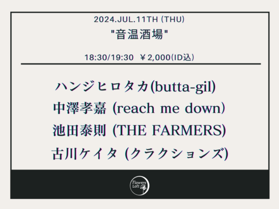 SCHEDULE 2024 07 11 Thursday 音温酒場 -neon sakaba- OPEN 18:30 - START 19:30 Tweet 出演: 中澤孝嘉 (reach me down) 池田泰則 (THE FARMERS) ハンジヒロタカ(butta-gil) 古川ケイタ (クラクションズ) TICKETADV/DOOR 共に¥2,000 (1D込) チケット: 出演者予約または以下より Share このイベントの予約は締めきりました。